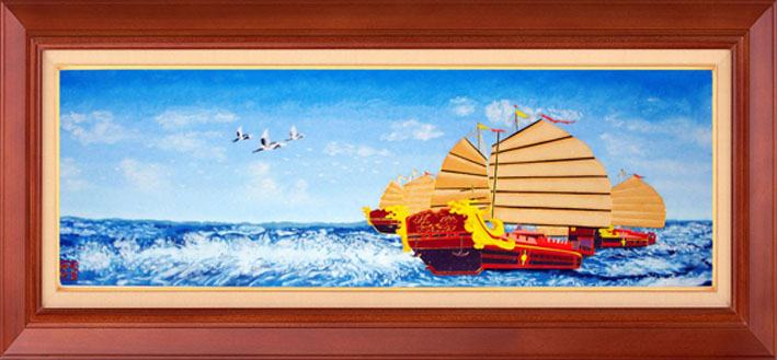說話間,一副陰郁的表情浮上了鄭總的臉上:后因連年災荒和戰亂,祖上便舉家從山東登州府遷至剛剛開封不久的河北興隆。雖然家境貧寒但創作砂畫的手藝并沒有放棄,也曾代代相傳。但終于經不住連年的災荒和戰亂,特別是那個“十年動亂”,砂畫被當作“四舊”而掃進了“歷史垃圾堆”。從此我們鄭氏砂畫的制作工藝便失傳了多年。直到2000年,作為鄭克祥第五代嫡孫的我,無意間發現了砂畫這樣的作品,才萌發重振祖業的念頭。于是,下山東、走登州,尋根問祖,拜師學藝。2001年在老家創建了制作砂畫的“工藝美術部”,2009年搬遷至興隆縣城,2010年10月成立了興隆縣鄭氏砂藝文化有限公司, 經過一番努力,鄭氏砂畫終于在2016年被評為河北省非物質文化遺產。