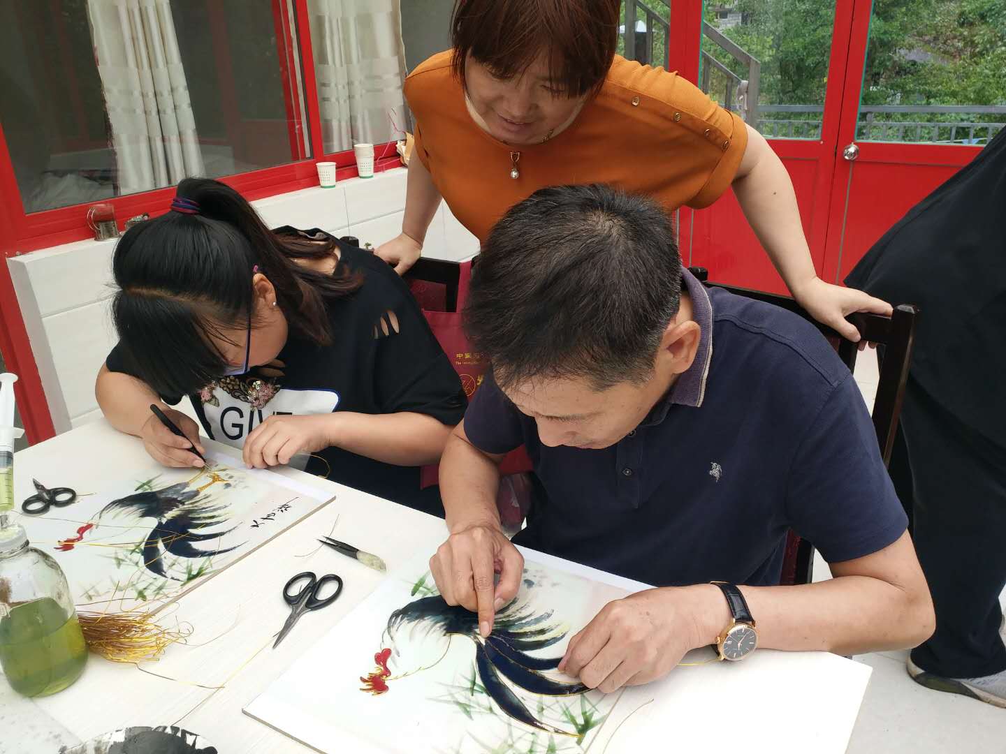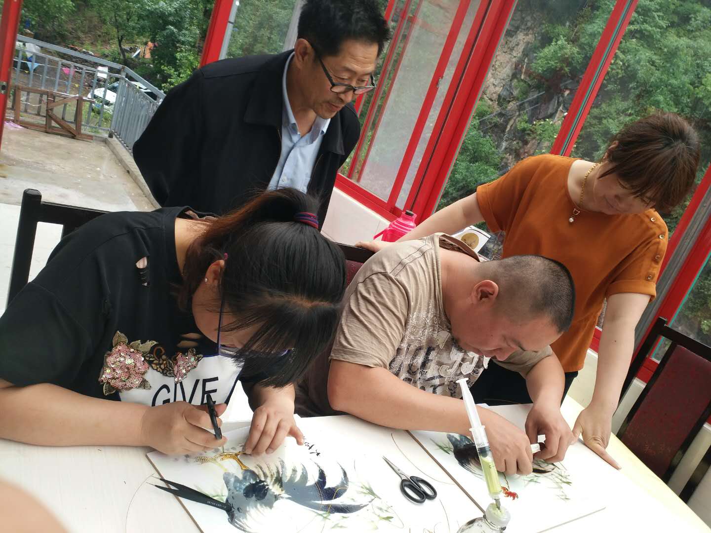 天津圣澤大通書畫院的老師們表示出對砂畫藝術的喜愛和贊賞,現場學習制作。