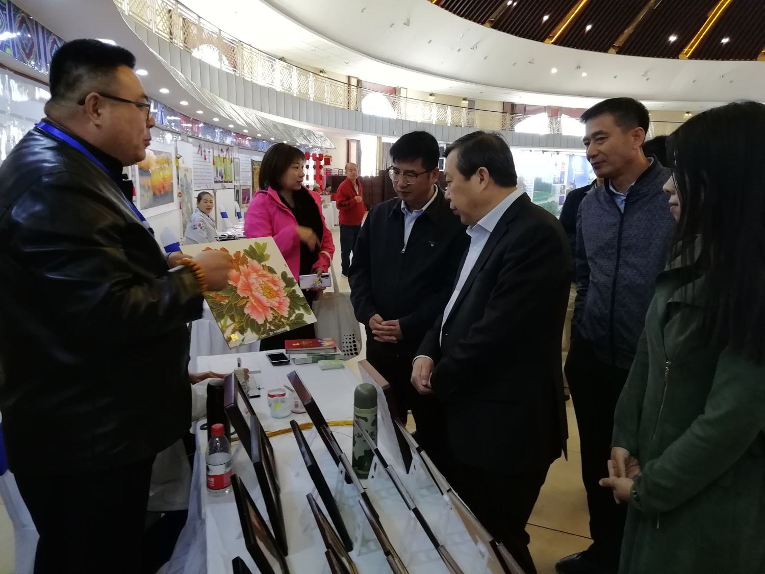 鄭氏砂藝董事長鄭鐵軍省文化和旅游廳黨組 副書記 副廳長 翟玉虎(右三)承德市旅游和文化廣電局副局長王鵬飛(右四)介紹鄭氏砂畫的特點和發展歷程