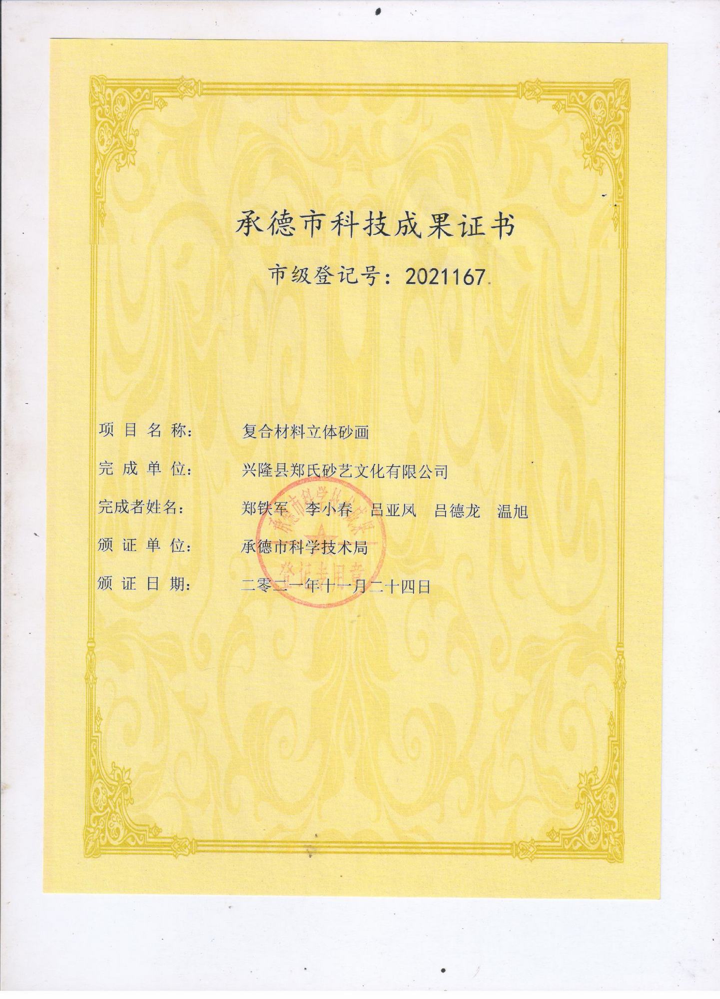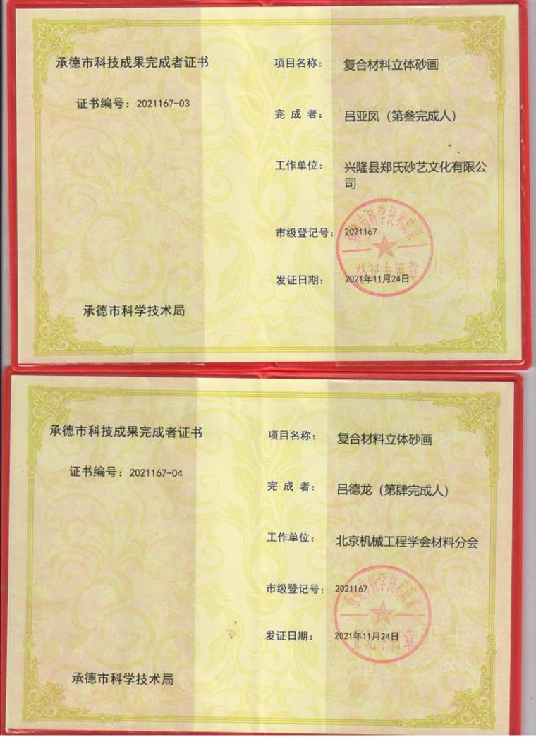 2021年11月24日,鄭氏砂藝圓滿完成了復合材料立體砂畫項目,獲得由承德市科技局頒發的《承德市科技成果證書》(市級登記號:2021167),該項目課題來源于承德市科學技術研究與發展計劃,由我公司和北京機械工程學會材料分會共同完成。項目以天然彩砂和金屬絲為主要材料,畫面中加入其它復合材料(如山楂核、樹葉等),制成立體砂畫,砂畫畫面采用透明樹脂壓膜技術,保持彩砂畫面與膜不脫落,不褪色。通過該項目的研究,企業創新產品5個系列200多種作品,其中包括:砂畫木質筆筒系列、水晶砂畫系列、砂畫手機殼系列、磁盤砂畫系列、活性炭砂畫系列,極大的提升企業產品質量。