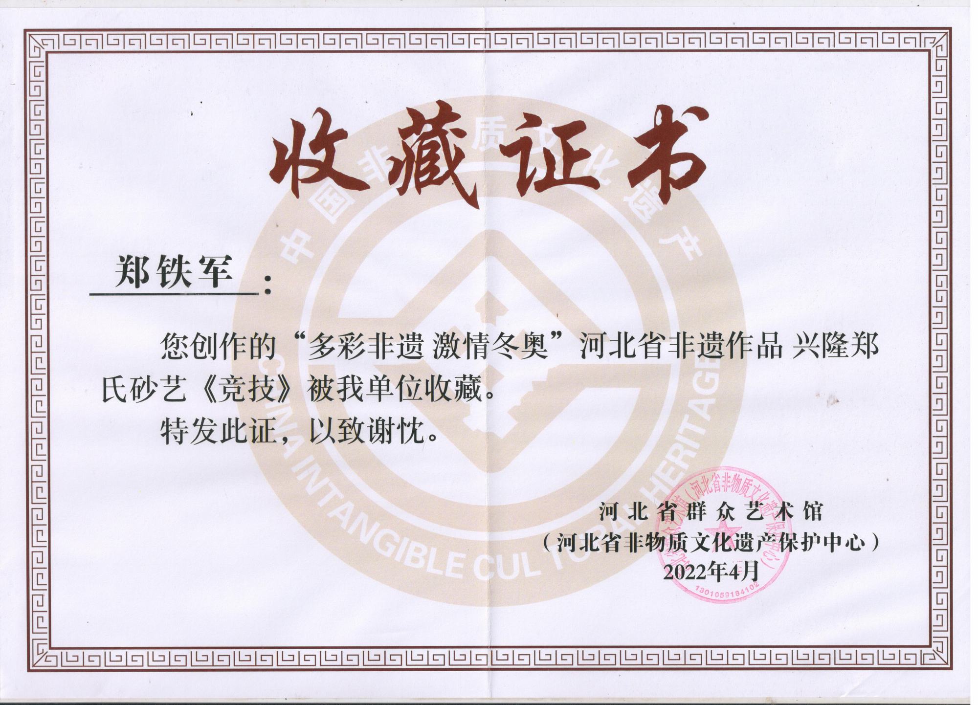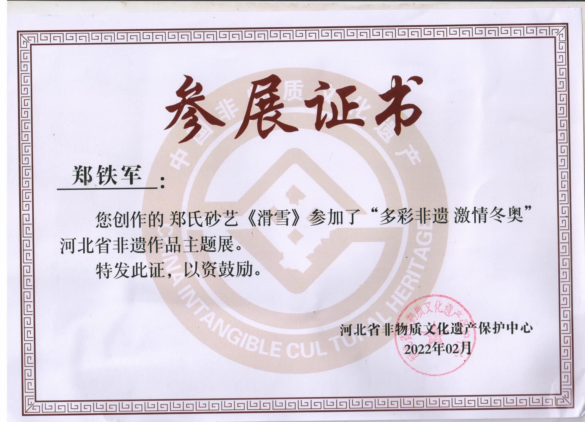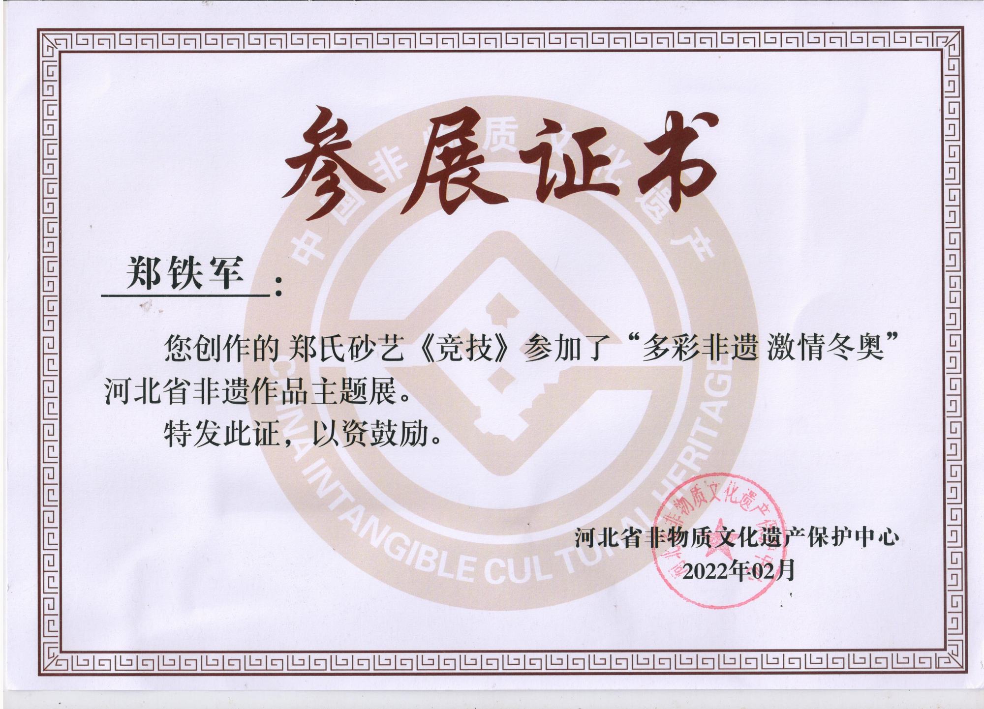 2022年北京冬奧會是我國重大歷史節點的重大標志性活動,也是河北省推動京津冀協同發展、雄安新區規劃建設、冬奧會籌辦“三件大事”之一。因此省群眾藝術館(省非遺保護中心)按照河北省文化和旅游廳的部署在全省開展了“多彩非遺激情冬奧”非遺主題作品征集活動,本次作品以冬奧文化、冰雪文化、春節文化為題材,通過藝術展現冰雪運動,應邀鄭氏砂藝執行董事國際工藝美術大師鄭鐵軍創作的砂畫作品《滑雪》、《競技》兩幅作品參展,并被省群眾藝術館和省非物質文化遺產保護中心永久收藏。