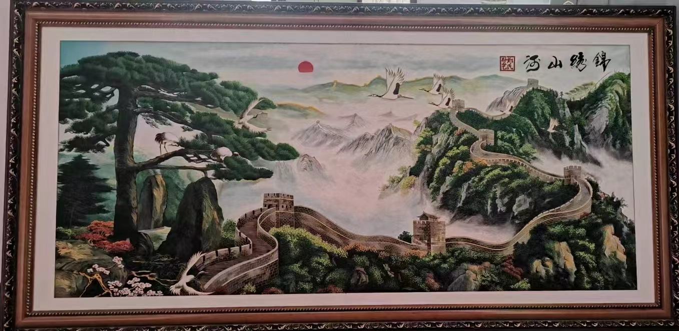 整幅畫以高山、長城、云霧、旭日、大雁、迎客松以及巧妙的畫技呈現了祖國大好河山的壯麗景色。,畫中山情水勢,脈落分明,虛實并舉,映帶盤旋,具有"神而不盡"的詩情畫意。所以這幅《錦繡山河》是會議室、辦公室和居家裝飾的最佳裝飾品!是鎮宅納財之靈寶,具有極高的觀賞和收藏多重價值!