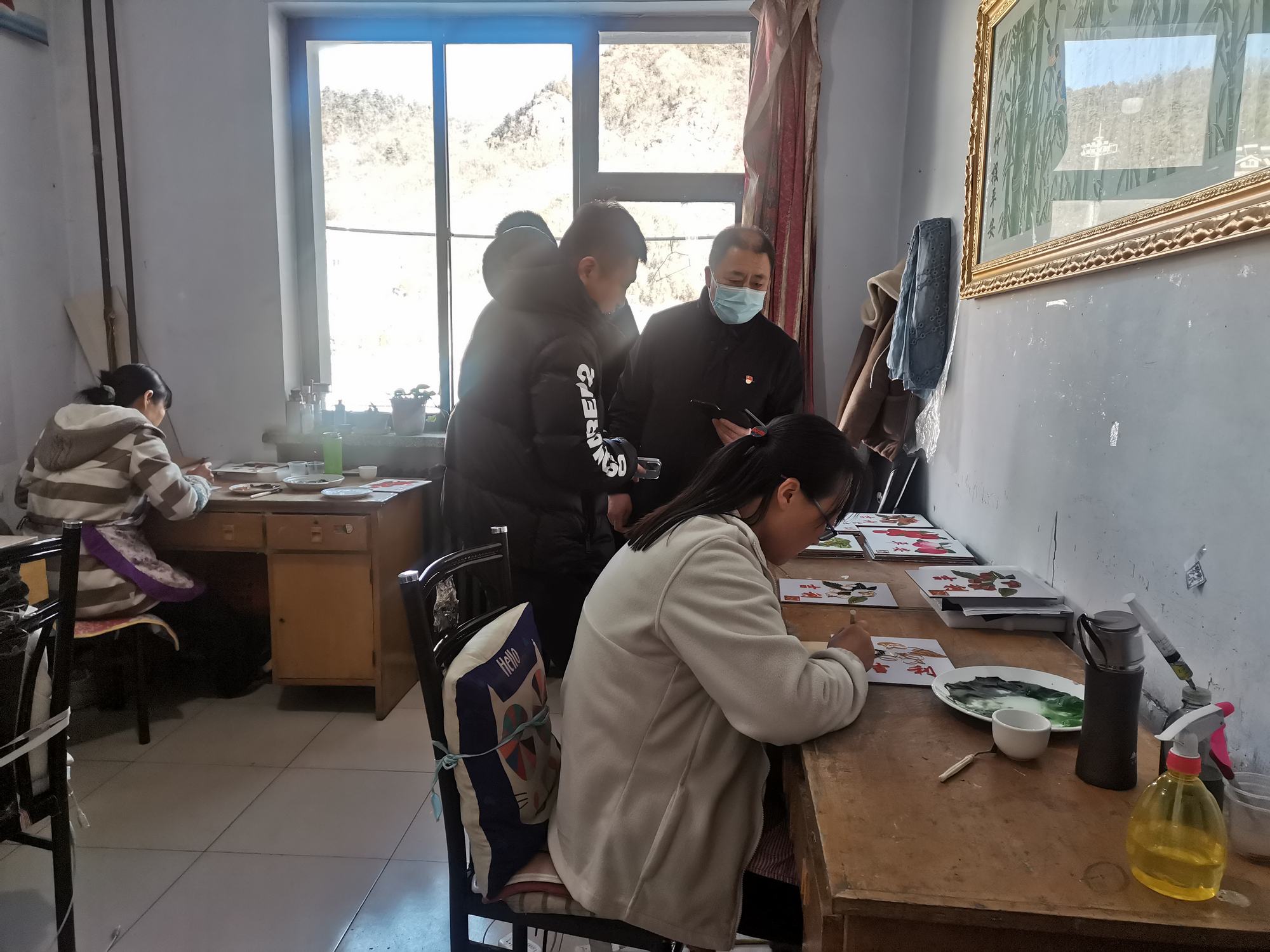 隨后,李曉軍主任和趙楠主任參觀了鄭氏砂藝生產車間,觀看了砂畫制作材料和制作過程,并對砂畫的研發方向給予了建設性的指導。