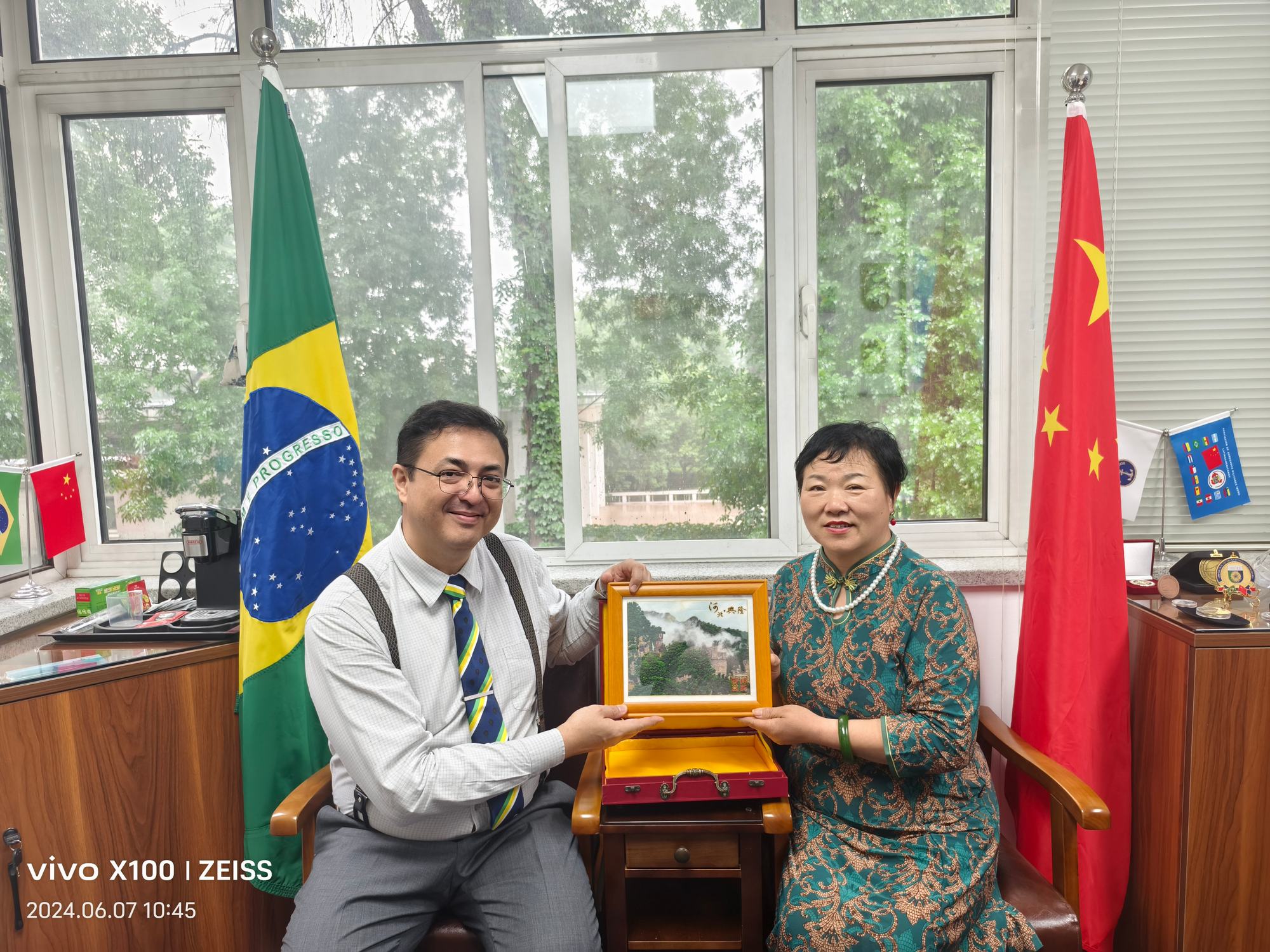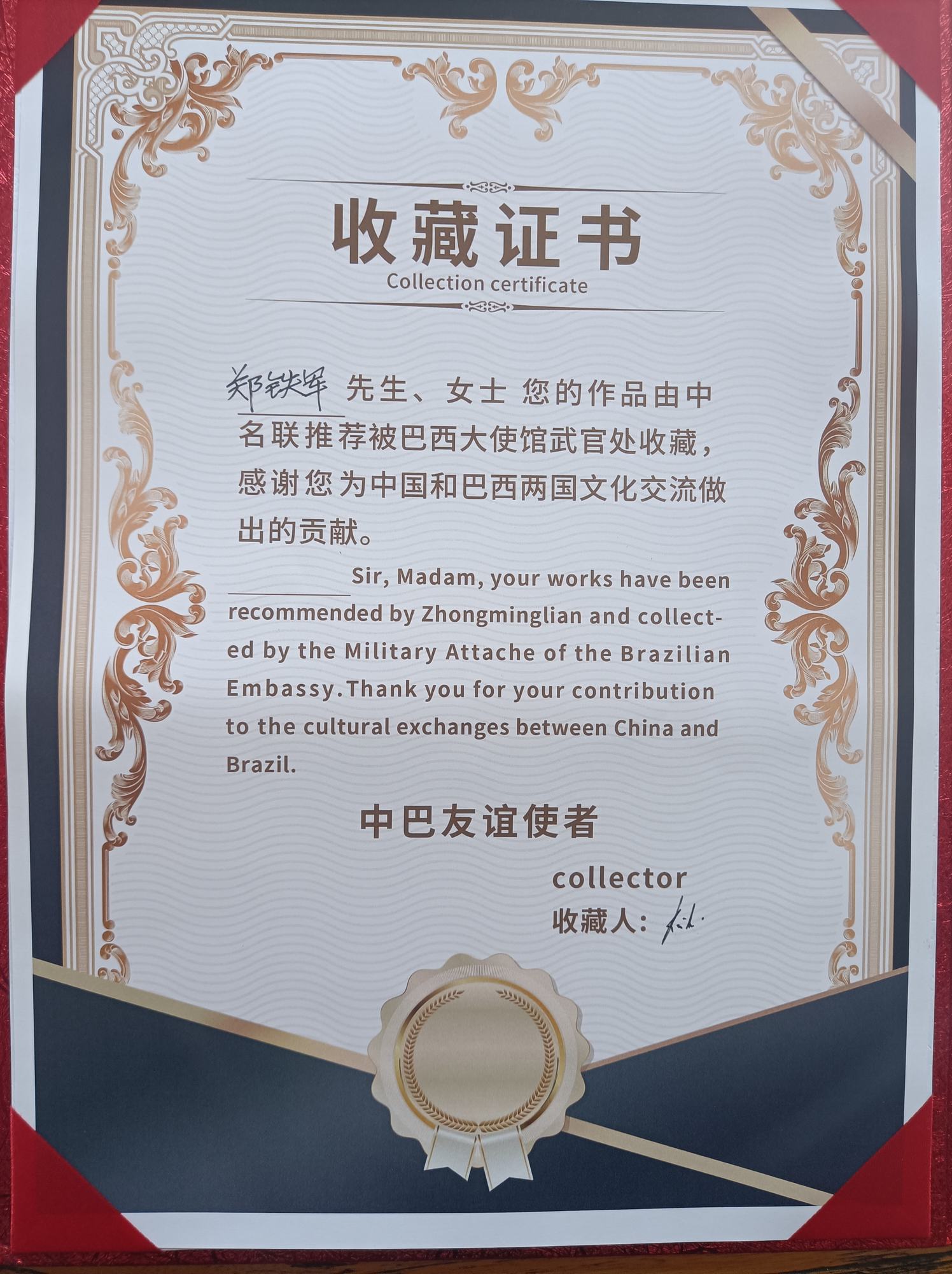 2024年6月7日,應(yīng)巴西駐華大使館邀請(qǐng),鄭氏砂藝(畫)形象代言人劉秀華攜中名聯(lián)簽約國禮藝術(shù)家鄭鐵軍老師的作品到使館進(jìn)行文化交流,巴西外交官對(duì)鄭鐵軍老師的作品高度評(píng)價(jià),對(duì)鄭鐵軍老師作品所蘊(yùn)含的深厚的中華傳統(tǒng)文化底蘊(yùn)極其贊賞,現(xiàn)場把鄭鐵軍老師作品《興隆山》作為國禮珍藏,贈(zèng)送全球友華政要。巴西駐華大使館現(xiàn)場為中名聯(lián)簽約國禮藝術(shù)家鄭鐵軍老師頒發(fā)了中巴文化交流使者收藏證書。