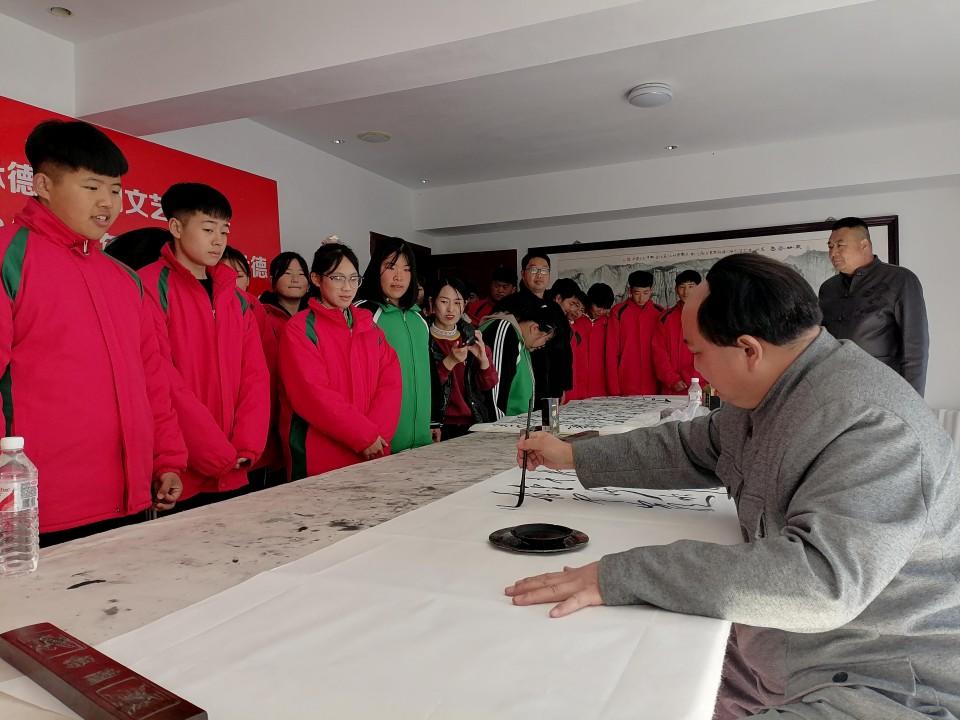 在鄭氏砂藝的書法室里,師生們還遇到了一個特別的嘉賓——國家特型演員、國家一級書法家趙士奎老師。趙老師正在那里進行書法創作,他的到來為這次參觀學習活動增添了一份特別的意義。在趙老師書寫完《七律.長征》這一作品后,他簡短而深刻地講述了毛澤東思想的偉大之處,并勉勵在場的同學們要向偉人學習,努力為中國的繁榮富強貢獻自己的力量。
