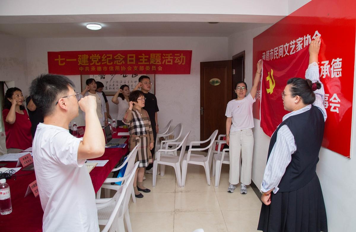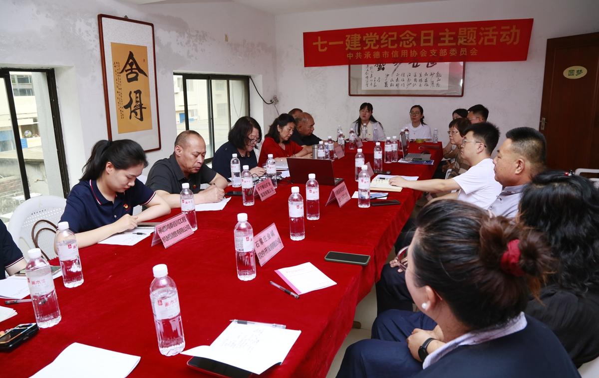 隨后,市信用協會黨支部開展了黨建交流環節。主持人王一然開場闡述建黨節意義及活動主題,鄭氏砂藝工會主席張國新分享企業發展成果。全體人員集中學習了2025年“七一”前夕中央重要會議精神,聚焦全面從嚴治黨、高質量發展和誠信建設。緊接著,承德市信用協會黨支部書記高燕領誓,全體黨員重溫入黨誓詞,莊嚴承諾“為共產主義奮斗終身”。理事單位代表逐一介紹自身情況,豐寧順達礦業集團副總經理武鳳寶、興隆縣工商聯秘書長丁小虎及信用協會顧問初海云分別發表講話。