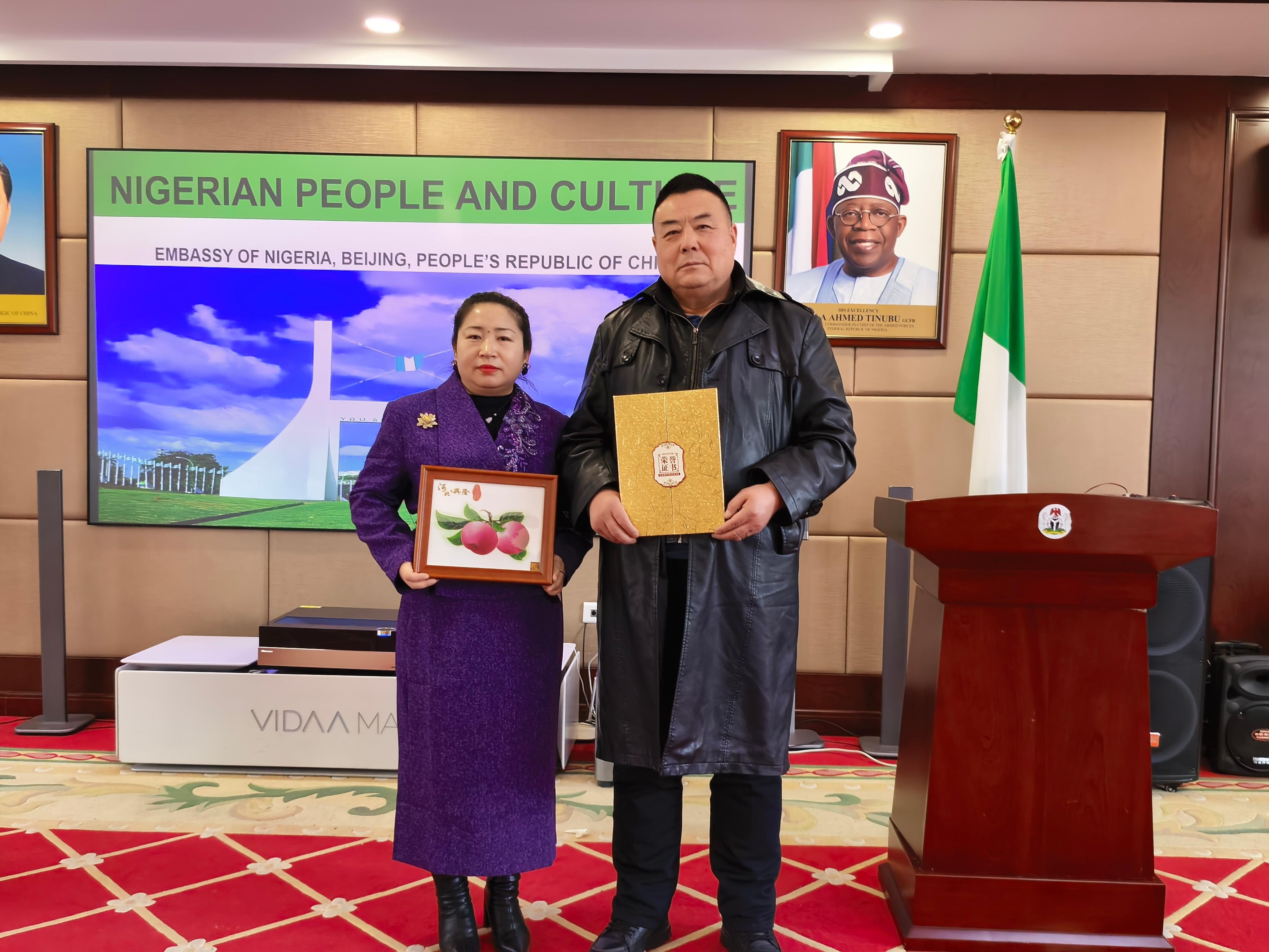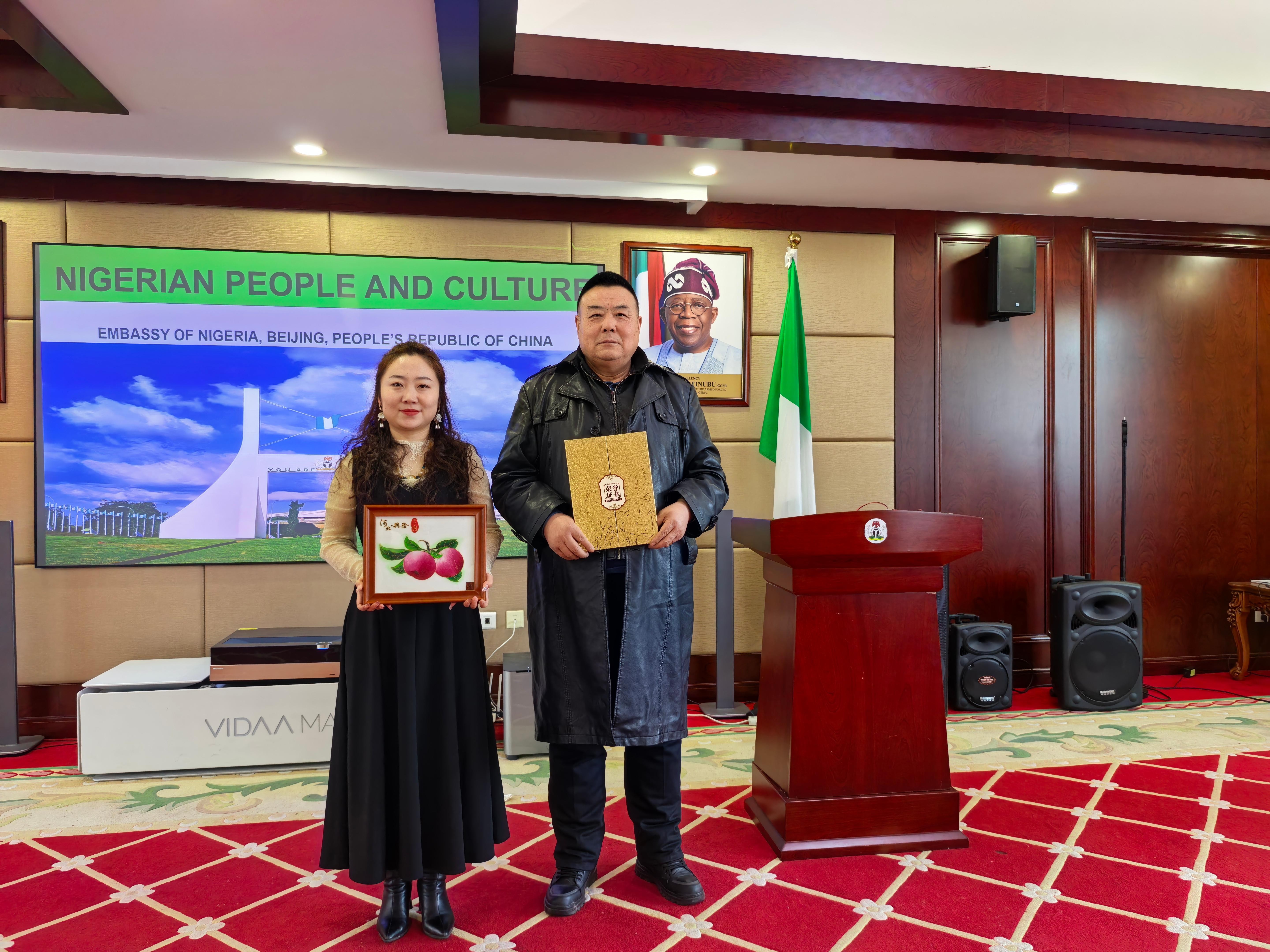 鄭鐵軍老師介紹道:“鄭氏砂藝起源于晚清秀才鄭克祥,歷經百年時光沉淀與五代匠人的薪火相傳,于21世紀初成功躋身省級非物質文化遺產名錄。該砂藝原料采自燕山腳下的彩色礦山,經精細研磨后,再經設計、制圖、掐絲、點藍、封裝等多道工序悉心雕琢,每件作品都承載著燕趙大地深厚的文化基因。此次收藏的砂藝作品《平安》更是寓意平安、吉祥與和諧,象征兩國發展蒸蒸日上。”尼日利亞駐華大使對這件砂藝作品贊不絕口,由衷贊嘆道:“這件作品讓我深切感受到中華文化的博大精深。”大使當場宣布收藏這件作品,并簽字留念,同時表示:“鄭氏砂藝融合自然與人文,彰顯中國文化魅力;中尼文化交流搭建起相互了解的橋梁,期待更多非遺項目互鑒互融。我將把這件作品陳列在使館文化區,以此見證中尼文化交流的深厚情誼。”