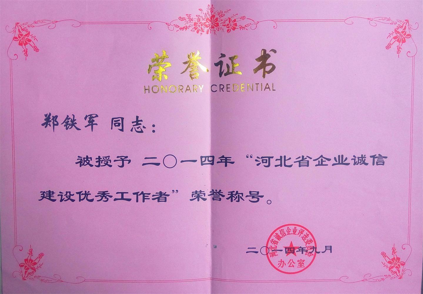 “河北省誠(chéng)信企業(yè)”及“河北省企業(yè)誠(chéng)信建設(shè)優(yōu)秀工作者”評(píng)選活動(dòng)每?jī)赡杲M織開展一次。2014年,經(jīng)過(guò)公司申報(bào)、基層相關(guān)部門審查推薦、省相關(guān)主管部門復(fù)審、評(píng)審專家委員會(huì)審核評(píng)選、社會(huì)公示等程序獲此稱號(hào)。這是公司首次獲此殊榮。